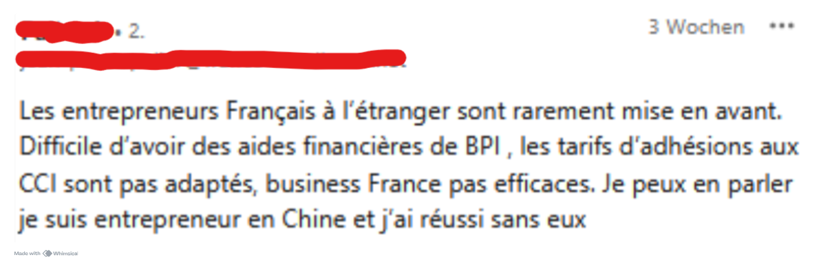 Une meilleure connaissance de ce tissu économique français à l’étranger ouvrirait la voie à une analyse fine de ses spécificités et permettrait d’adapter ou d’optimiser les offres proposées par ces mêmes réseaux. Celles-ci, souvent conçues à partir d’une logique hexagonale, ne correspondent pas toujours aux besoins réels des entrepreneurs et indépendants de la diaspora dans le pays d’accueil. L’écart ainsi constaté entre l’offre institutionnelle et les attentes du terrain souligne la nécessité d’une approche renouvelée, capable d’intégrer la diversité des profils, des parcours et des contraintes locales de ces acteurs, comme en témoigne le commentaire suivant: